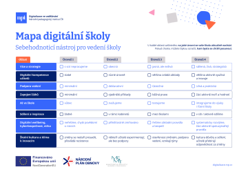 Mapa digitální školy je sebehodnoticí nástroj pro vedení školy v oblasti digitálního pedagogického leadershipu, díky které zjistíte, co už máte zvládnuté, kde jsou rezervy, a které oblasti stojí za další rozvoj.